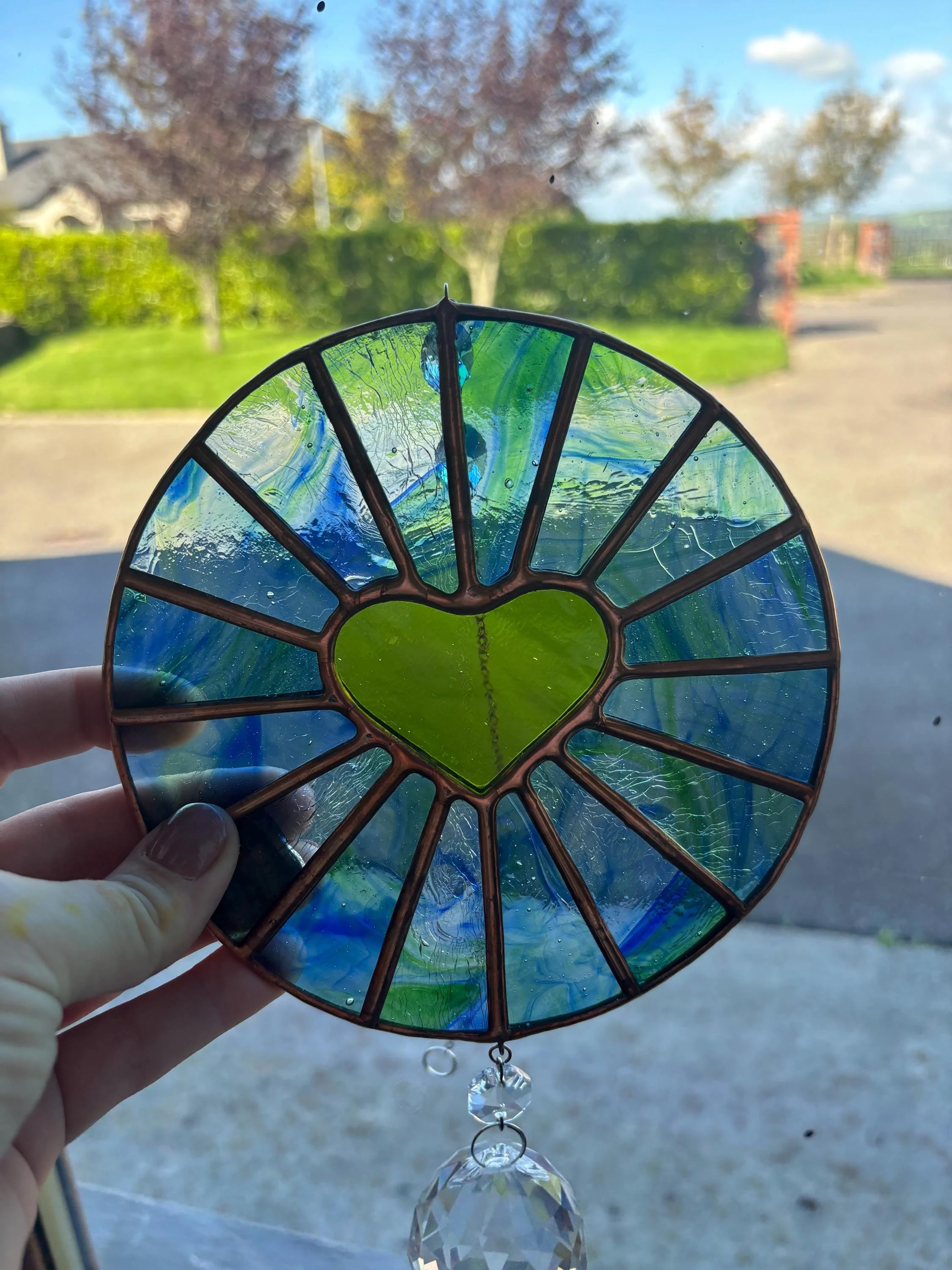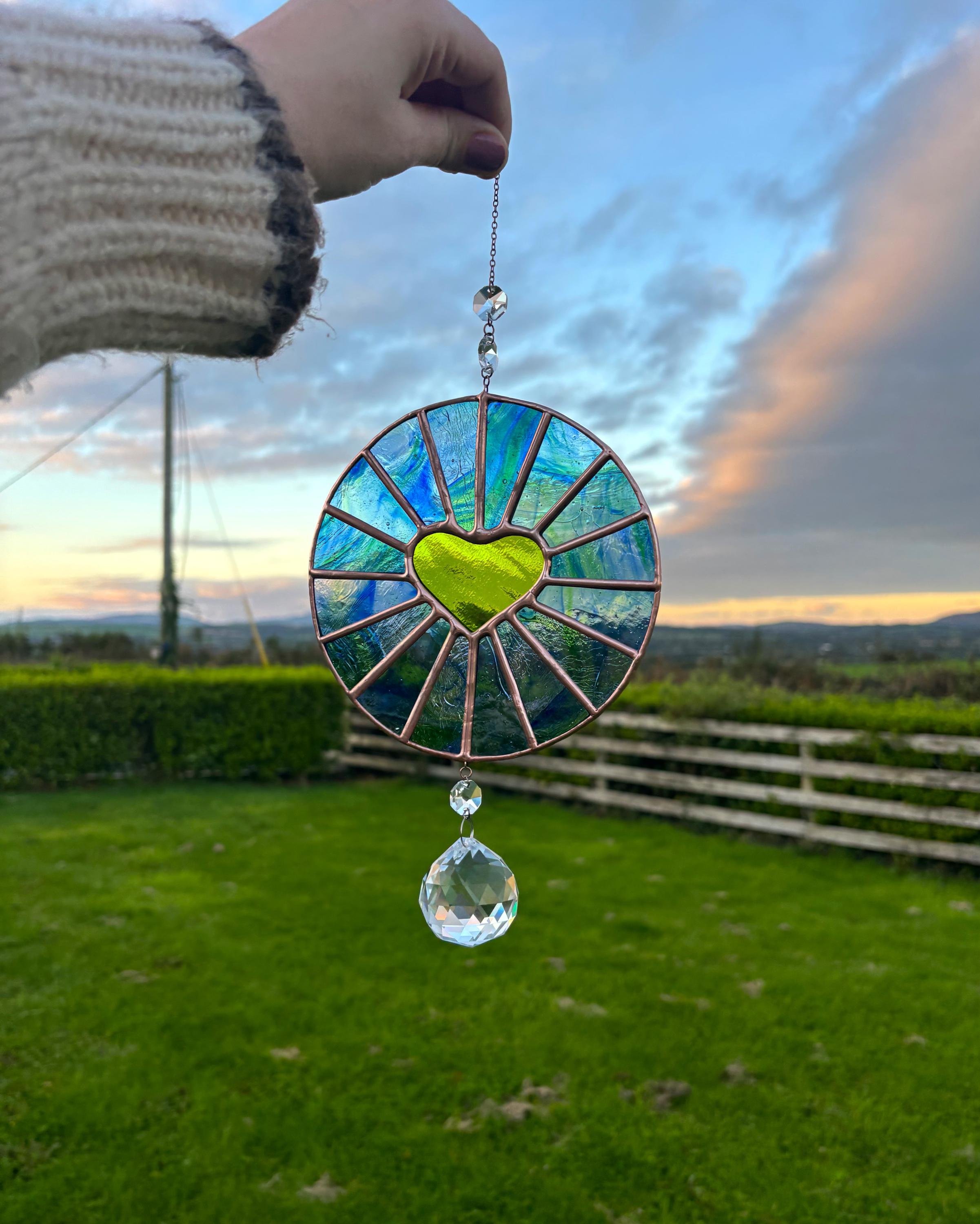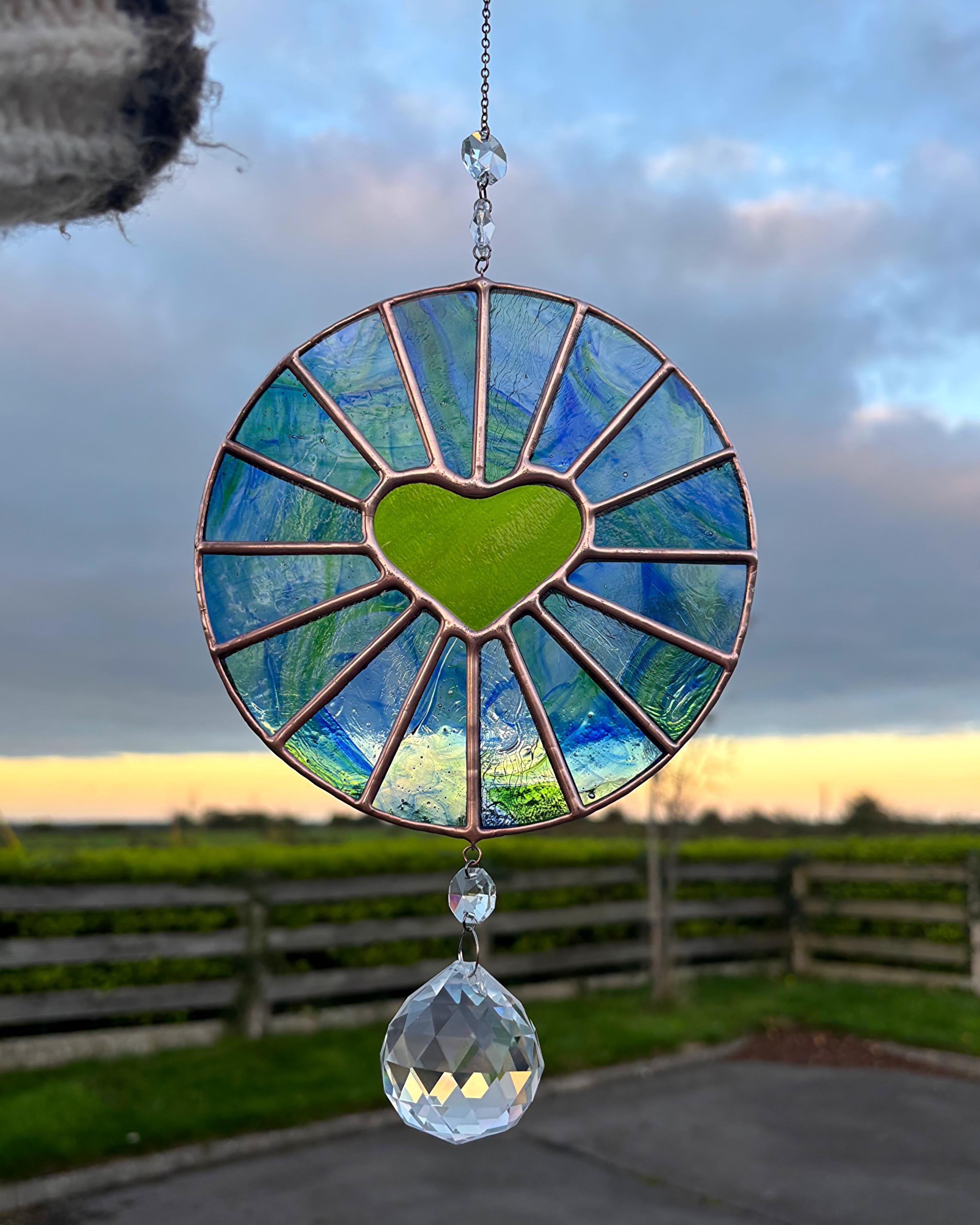 Handmade Stained Glass Blue/Green Heart Round Suncatcher w/ Crystal