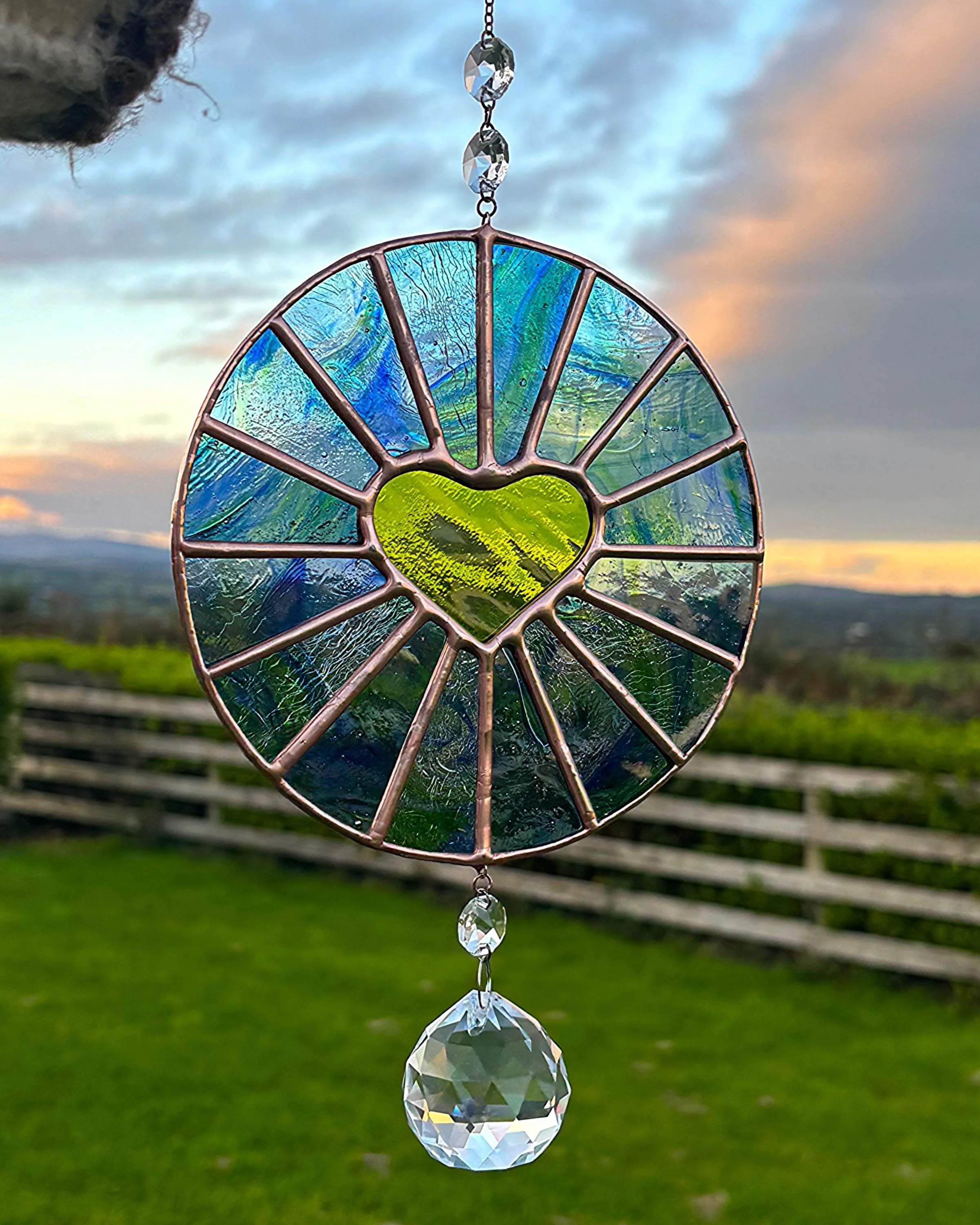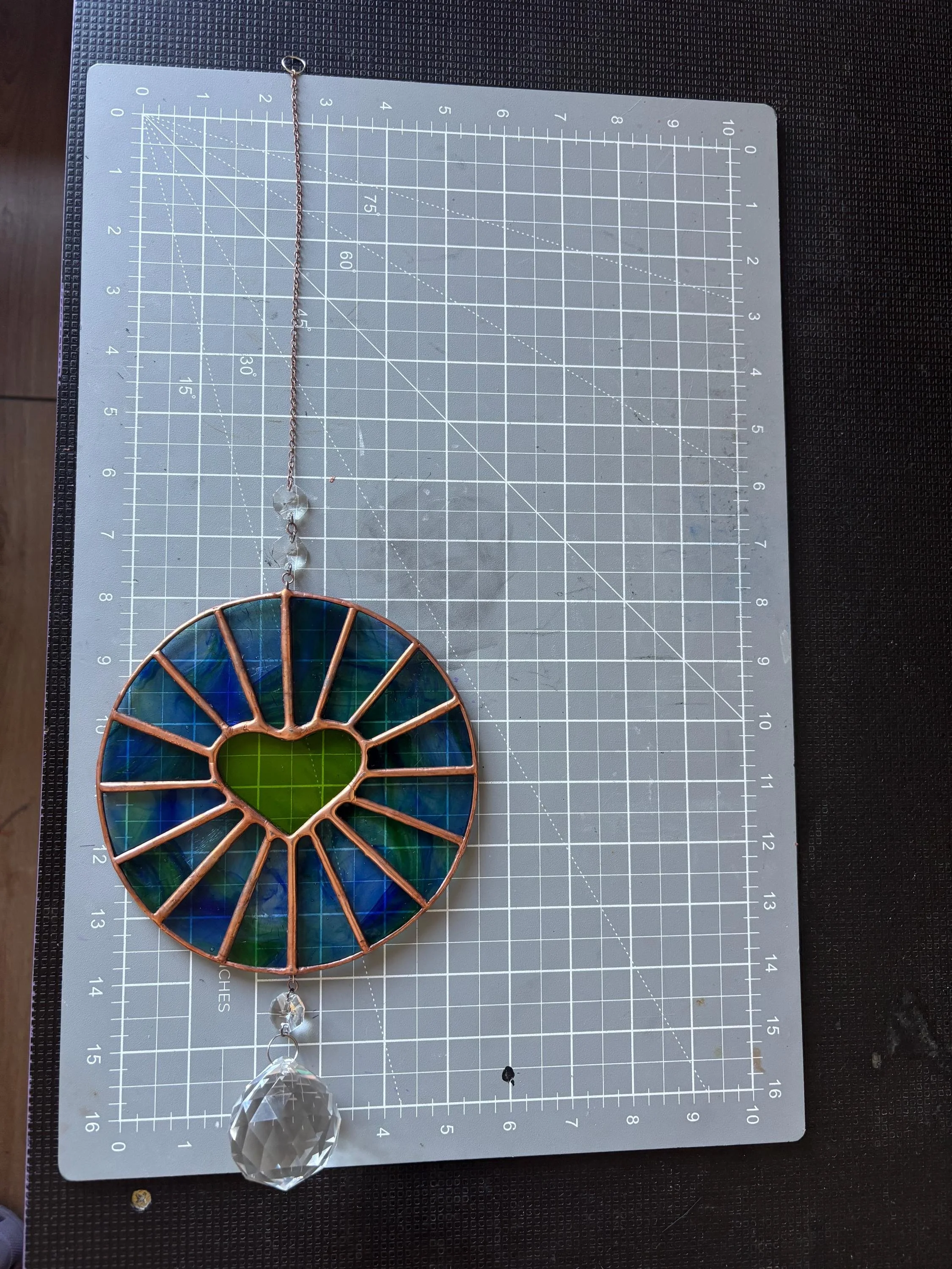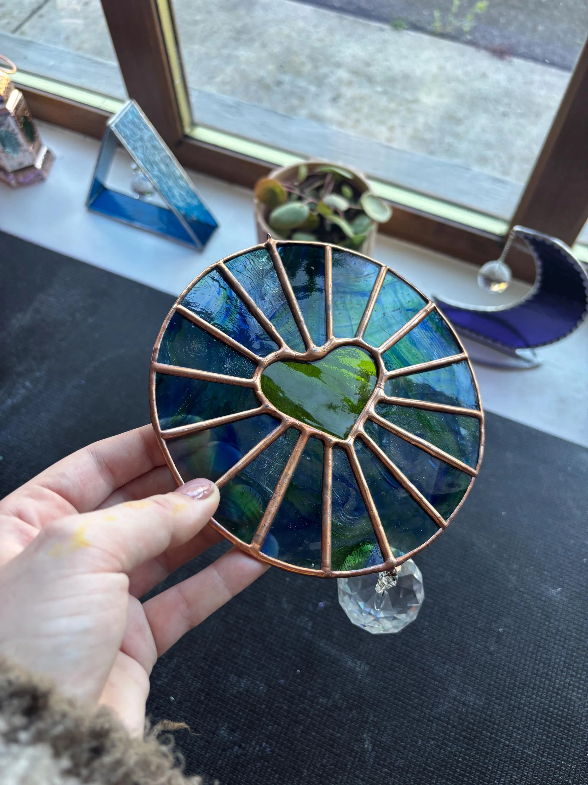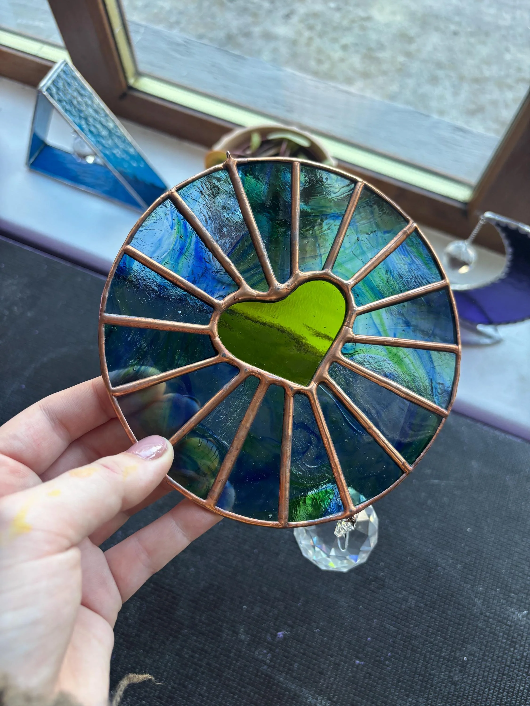 Handmade Stained Glass Blue/Green Heart Round Suncatcher w/ Crystal